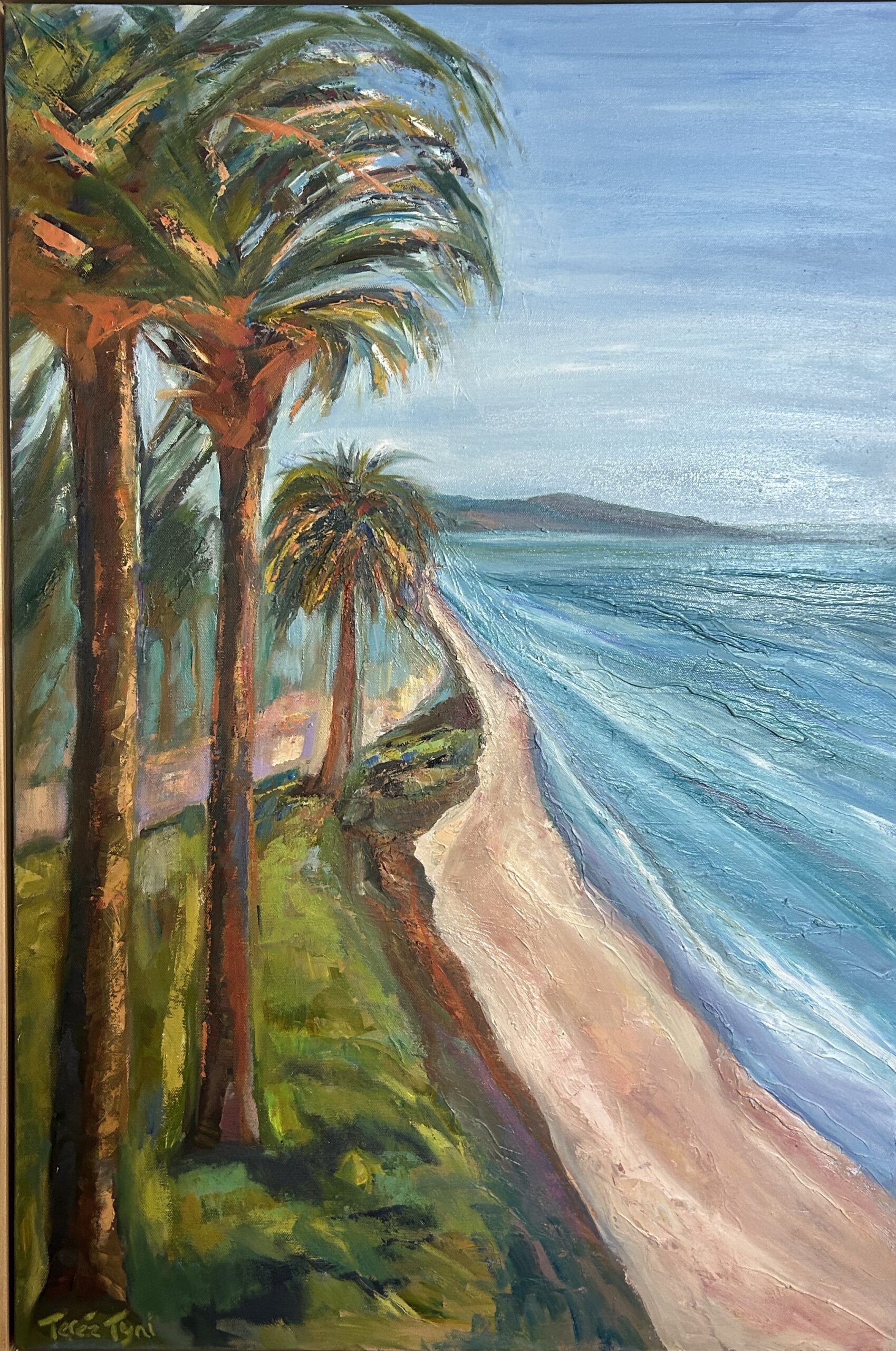 Butterfly Beach-Santa Barbara- 36×24 vertical oil framed in natural wood floater- creates a strong design with bold juicy strokes overlooking the heavily textured palm trees of Montecito’s famous Butterfly beach.