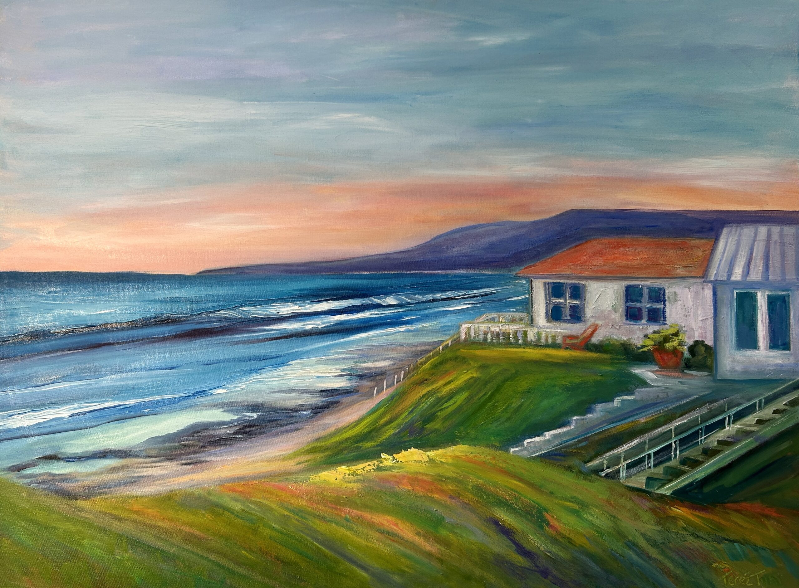 Cayucos Beach House- 30×40 Oil -Fun whimsical sunset contrasting with the bright beach house coastline using complementary colors for contrast.