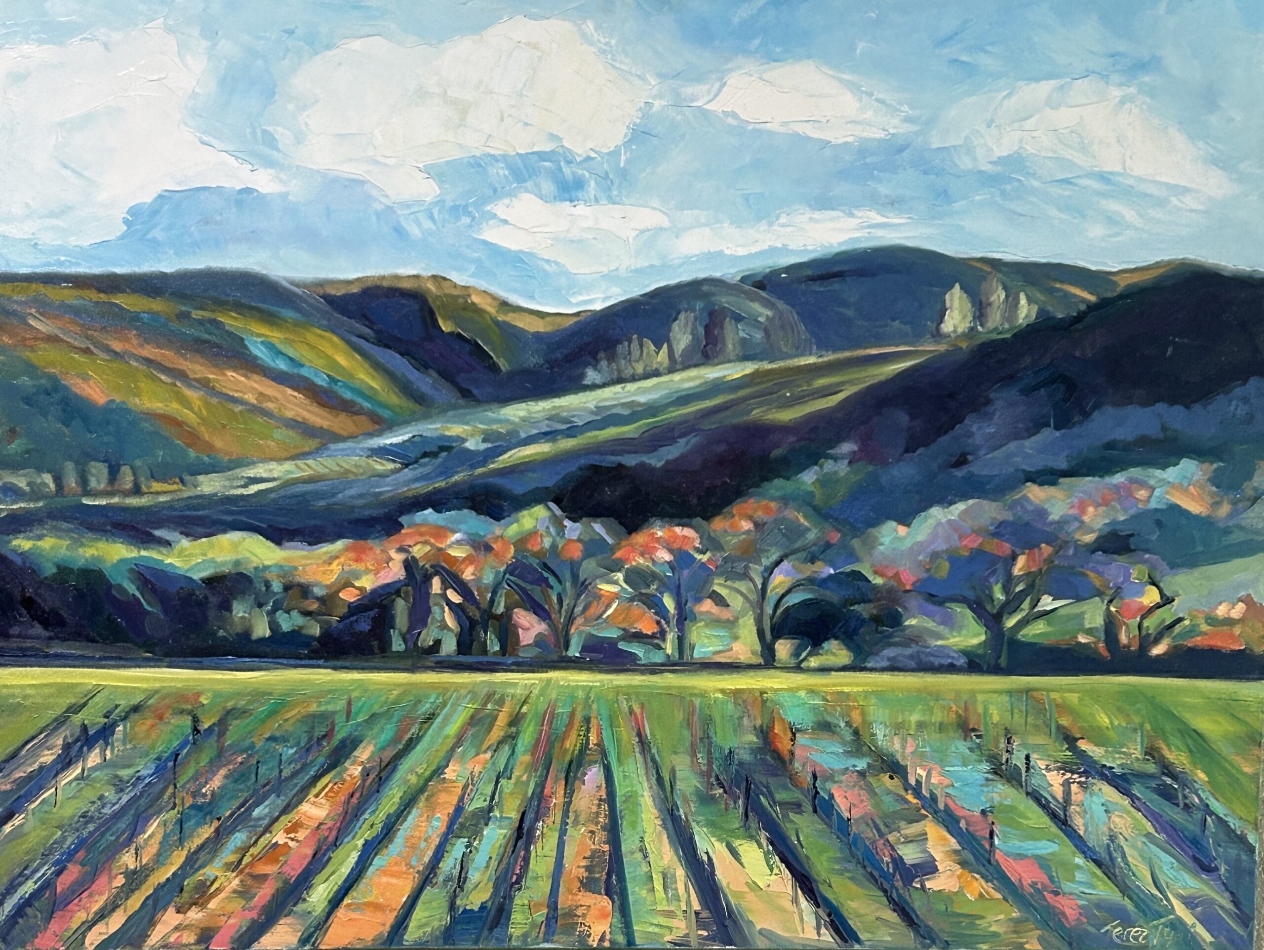 Colorscape- 30×40 oil on wide wrapped canvas painted fearlessly with bold patterns and strong warm and cool colors taking you deep into the landscape with a contemporary feel!
