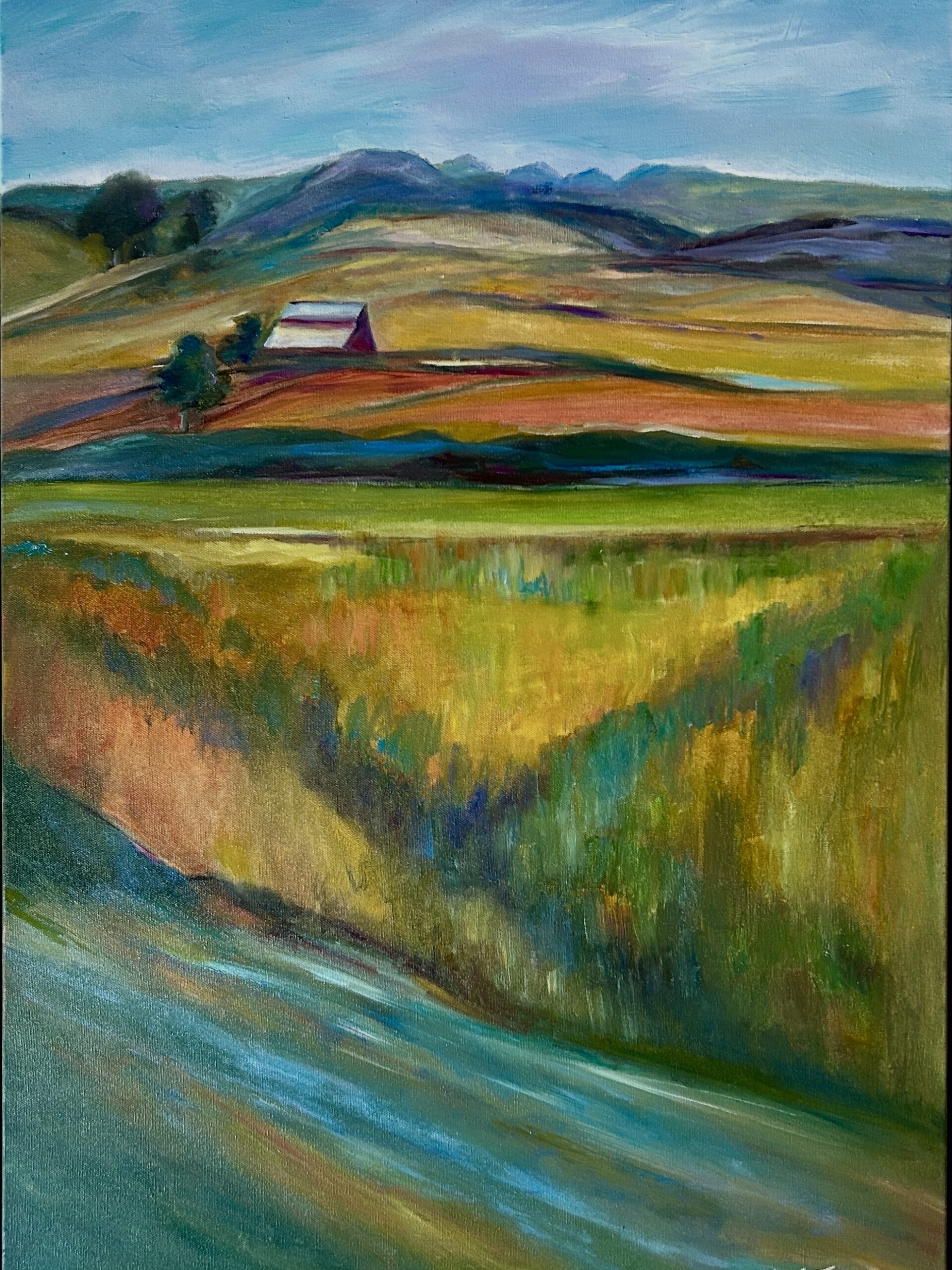 Los Osos Valley Road- 36×24 Oil framed in a natural wood floater-This recent painting is a part of my “Coastal Color series” designed with simplified semi abstract shapes of color creating light reflecting the mood of the area.