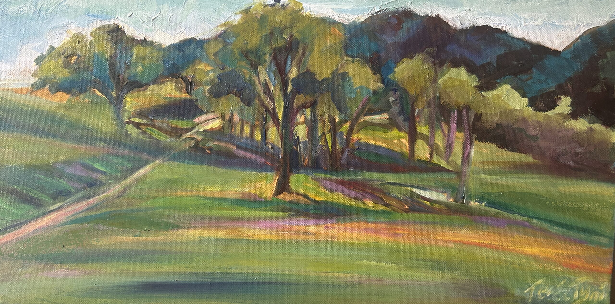 North County-10×20 Oil- after a plein air visit to Fort Hunter Liggett in May, this was one of the spots we painted in the middle of thousands of acres! The spring colors and interesting tree shapes allowed me to capture the day.