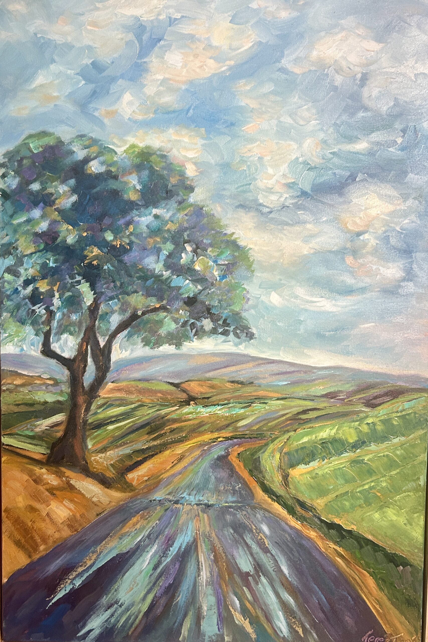 Out Yonder- 36×24 oil in natural wood floater frame-country winding roads throughout the north county are so peaceful and serene especially with the dappled light splattering the road. The colors are subdued yet strong creating a harmonized pallette.