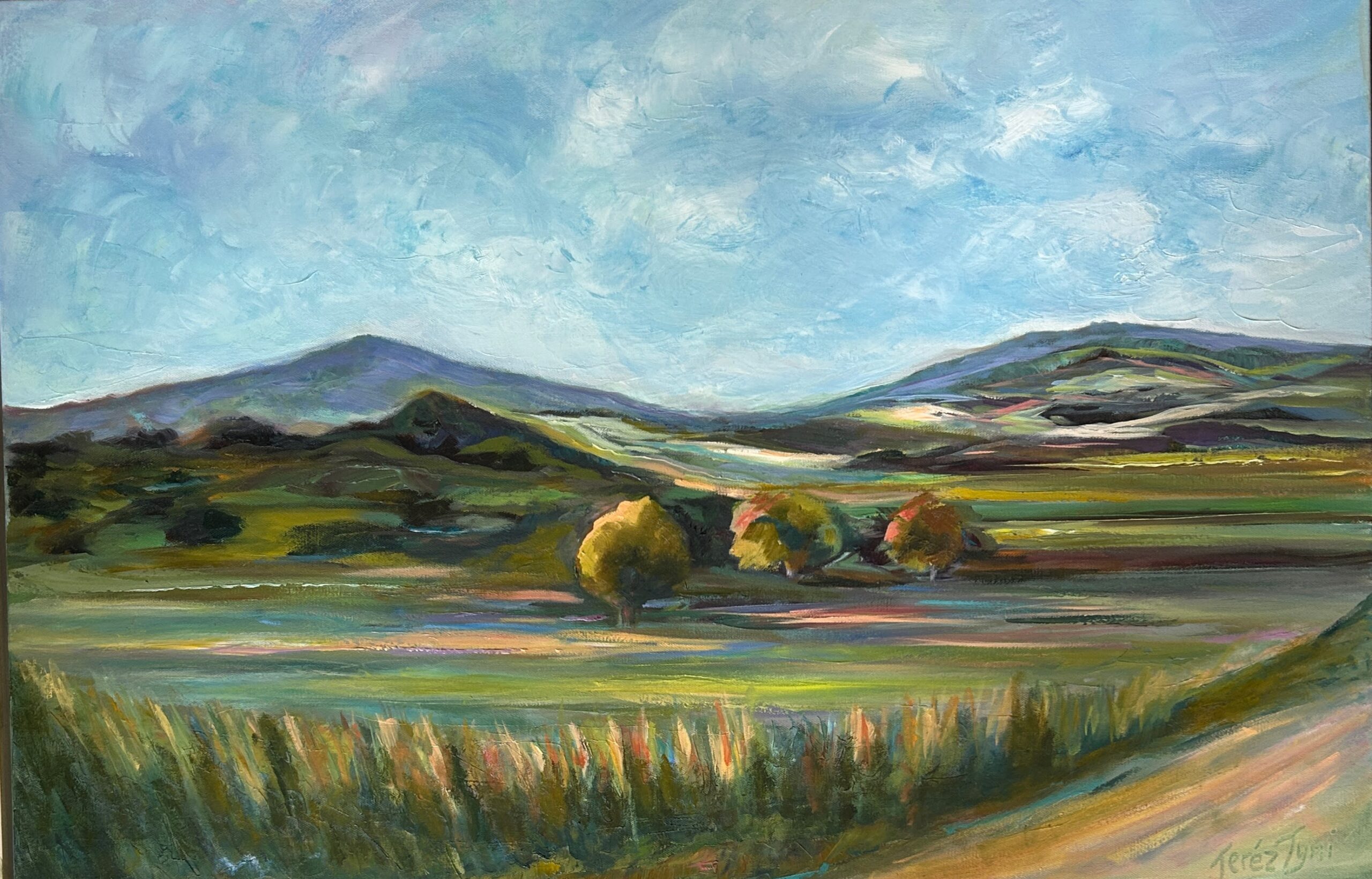 Paso Plains-24×36 Oil framed in natural wood floater- This scene was painted from a reference photo near north Paso Robles near Hunter Ligget- a military base we toured- I tried to capture the stillness and open space with bits of spring color and sunlight highlighting the scene.