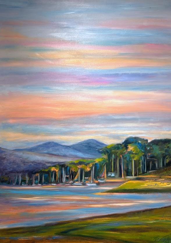 Sunset Bay- 40×30 Oil framed in a natural wood floater- Morro Bay sunsets are some of the most amazing in our beautiful Central Coast especially at dusk. THis painting in a vertical format and low horizon is calm and dramatic simultaneously.