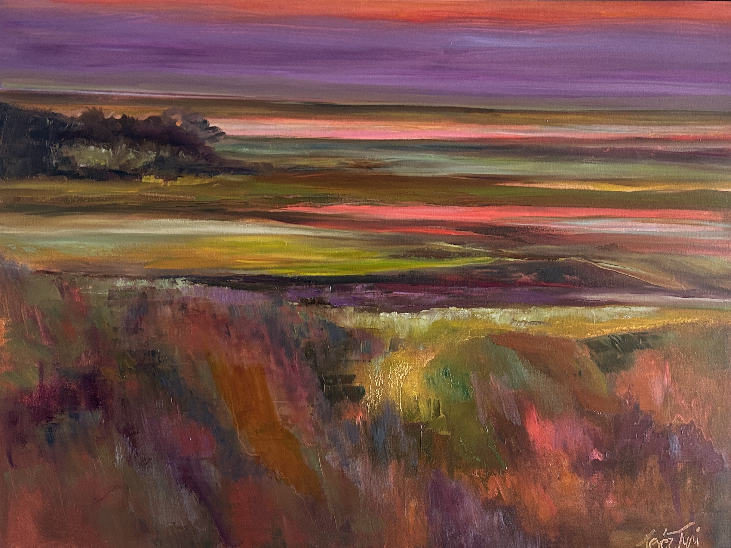 Twilight Headlands-30×40 Oil in natural wood floater-FIrst in a new series I’m calling “Twilight Preserves” focusing on bold saturated blended harmonious color to capture a feel of the rich Central Coast area.The use of unexpected color combinations create a mystery to this painting that I am exploring with less detail and using color as form.