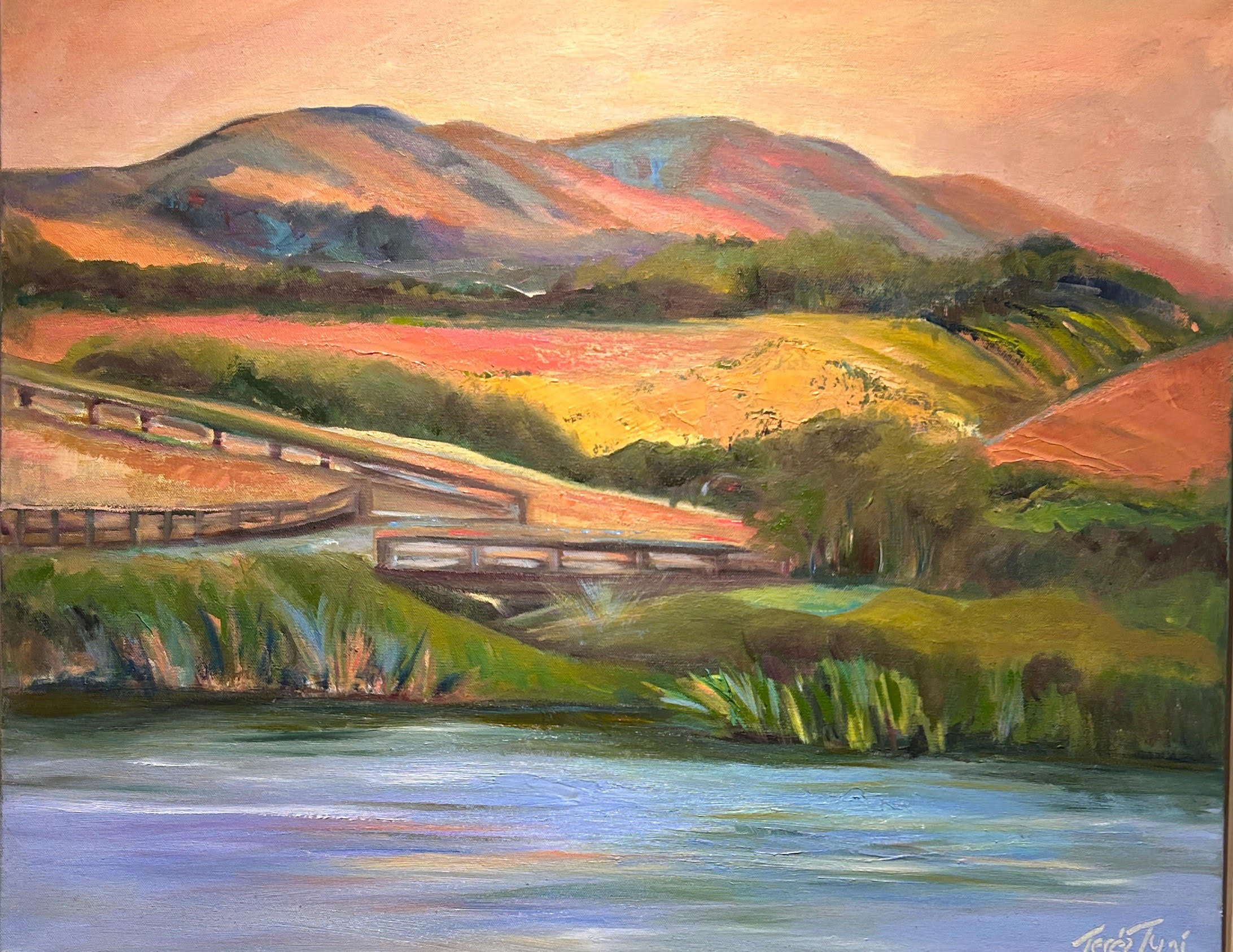 “View from La Lomita Ranch” 24×30 Oil framed in a wood floater -This recent painting was inspired from a candlelight summer concert we attended at the La Lomita Ranch estate in San Luis Obispo,Ca.The twilight hour gave a pink glow to the hills which felt so serene and peaceful.